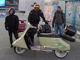De qualquer forma não levei a T5, tendo escolhido a minha montada mais experiente e fiável, a Heinkel, para me levar a uma almoçarada com amigos. Do Porto saíram os suspeitos do costume, e debaixo de uma temperatura que apesar do Sol embirrava em nos lembrar que estamos no Inverno, pela hora marcada lá arrancamos do Dragão. Em velocidade de cruzeiro, ou seja despachadinhos, lá chegamos a Aveiro pelas 9:30h. Tempo para um cafézinho enquanto esperávamos para engrossar a comitiva com uma Indiana e uma Portuguesa, dado que Italianas e Alemã já tínhamos.